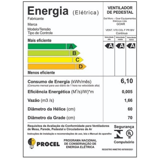 • Comodidade: o ventilador V70 Goar possui chave gradual de regulagem de velocidade, dando mais comodidade ao seu uso.